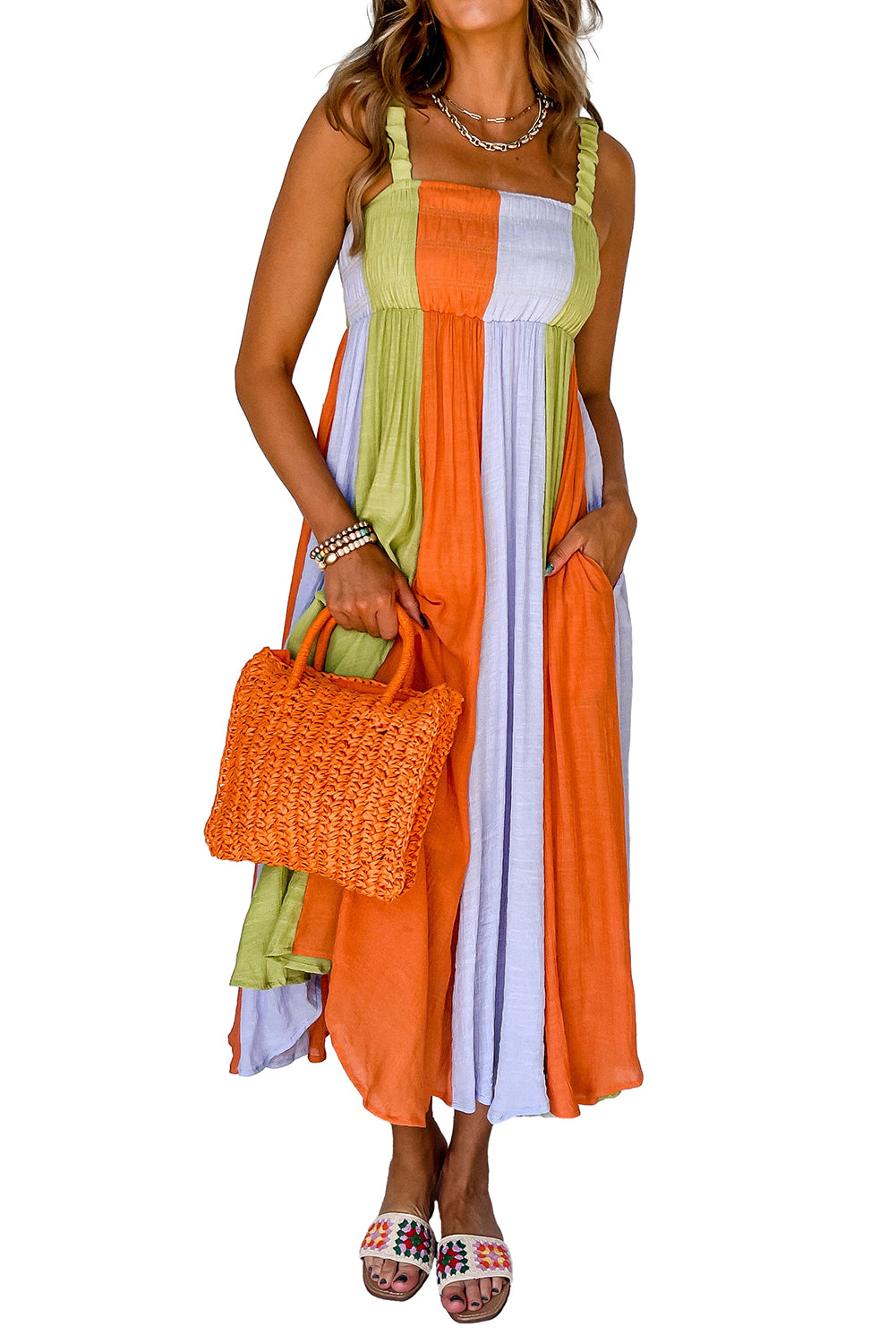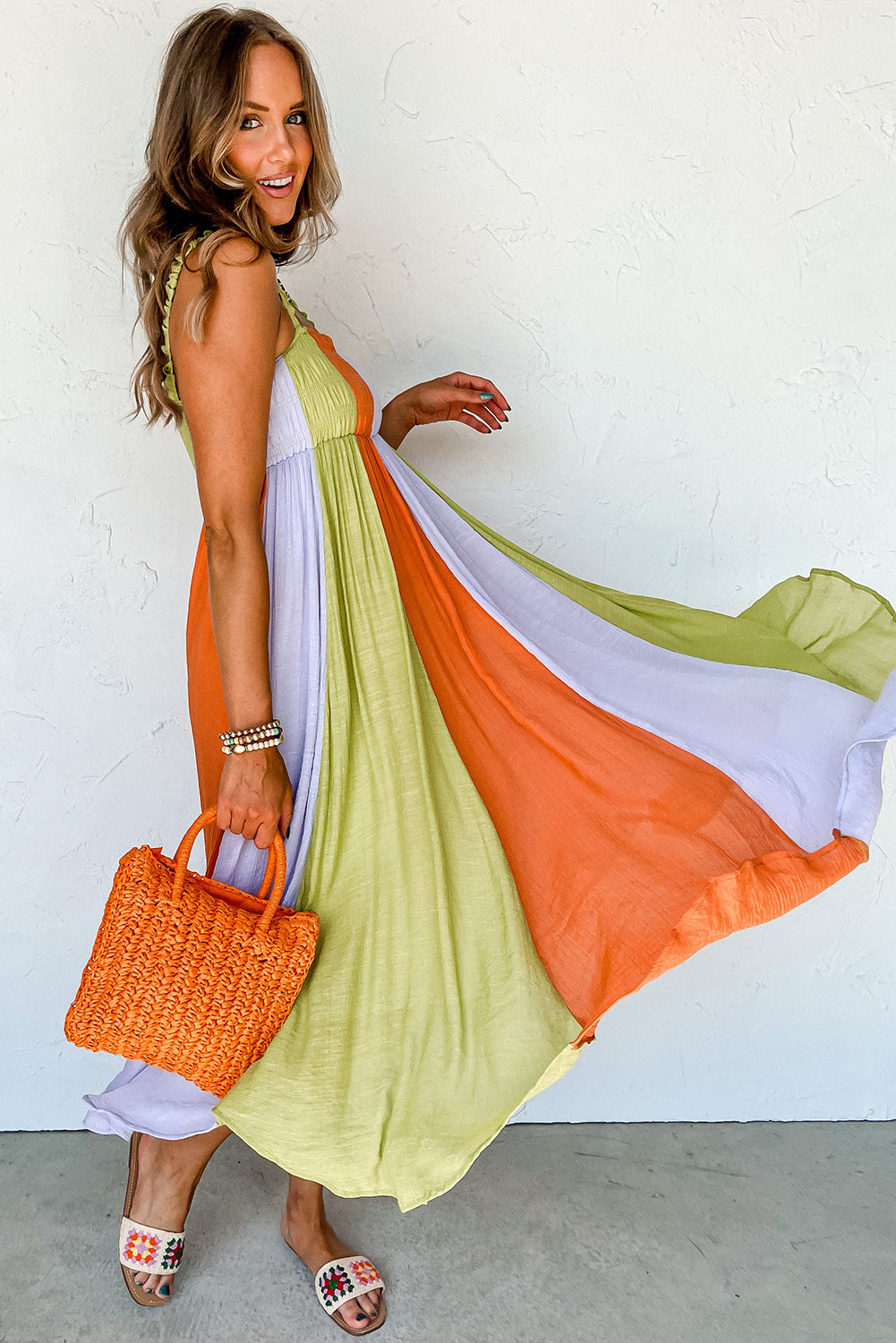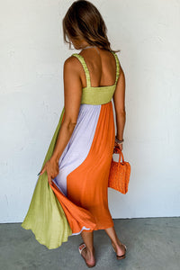 Green Color Block Shirred High Waist Pleated Maxi Dress
