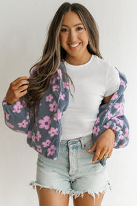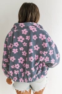Multicolor Flower Print Zip Up Sherpa Jacket