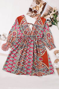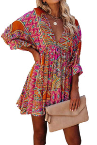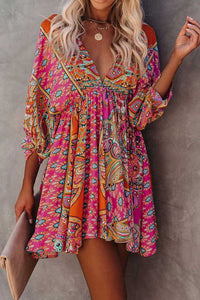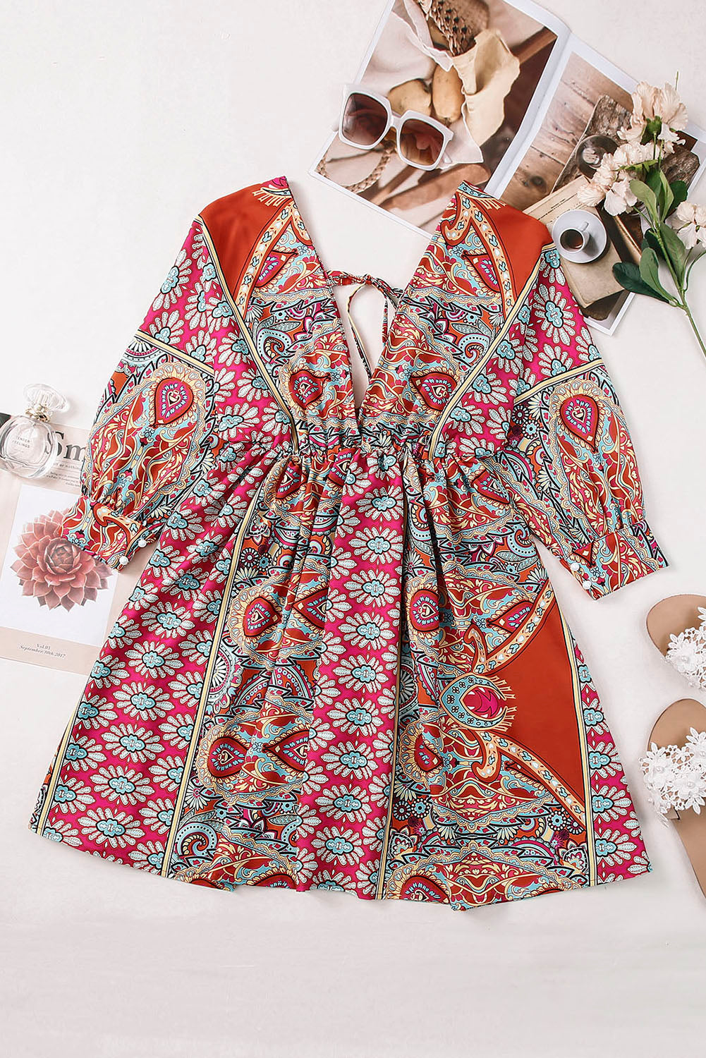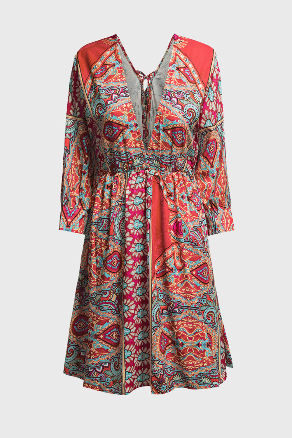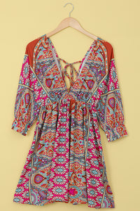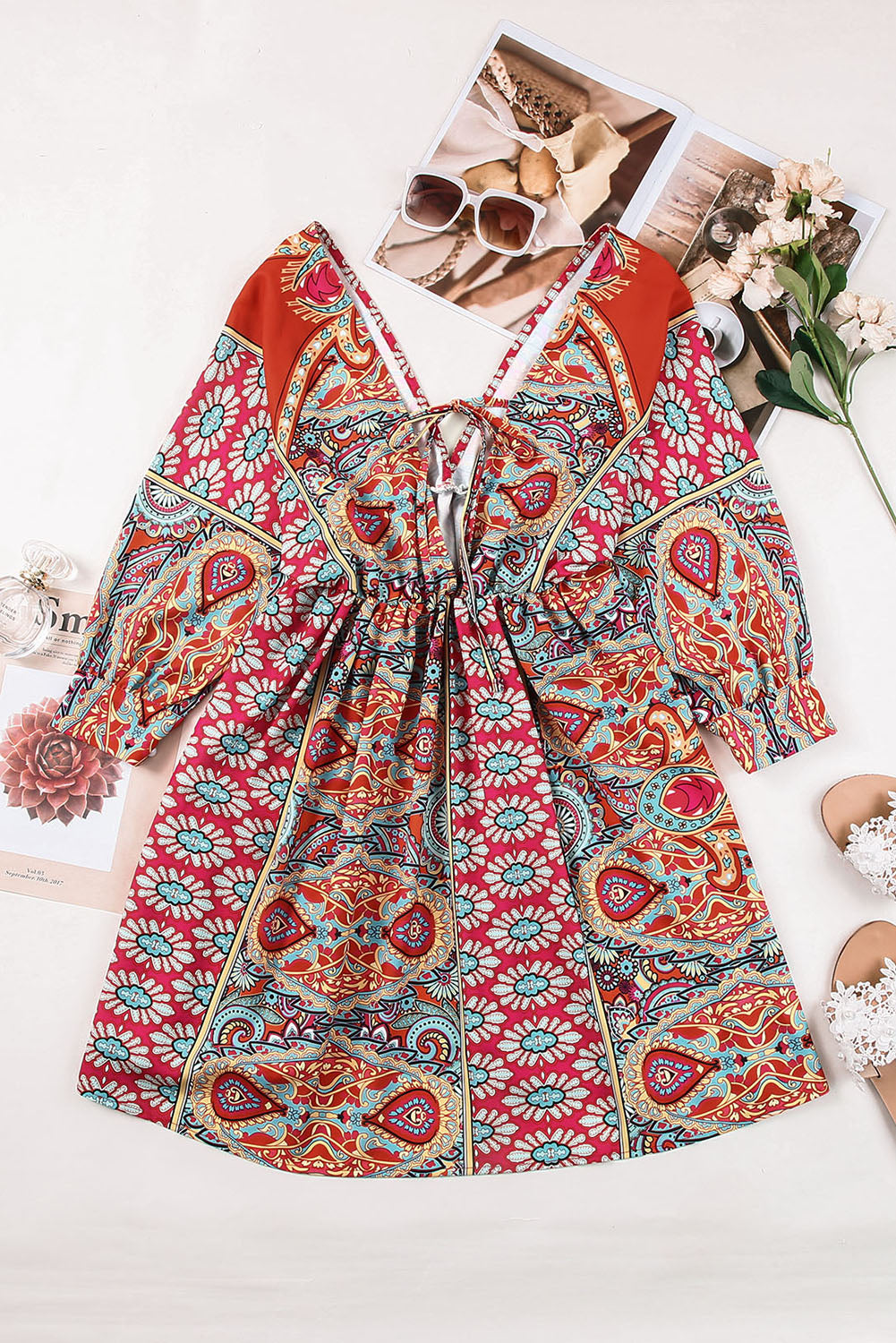 Multicolor Sexy Plunge Neckline 3/4 Sleeve Tie Back Boho Dress