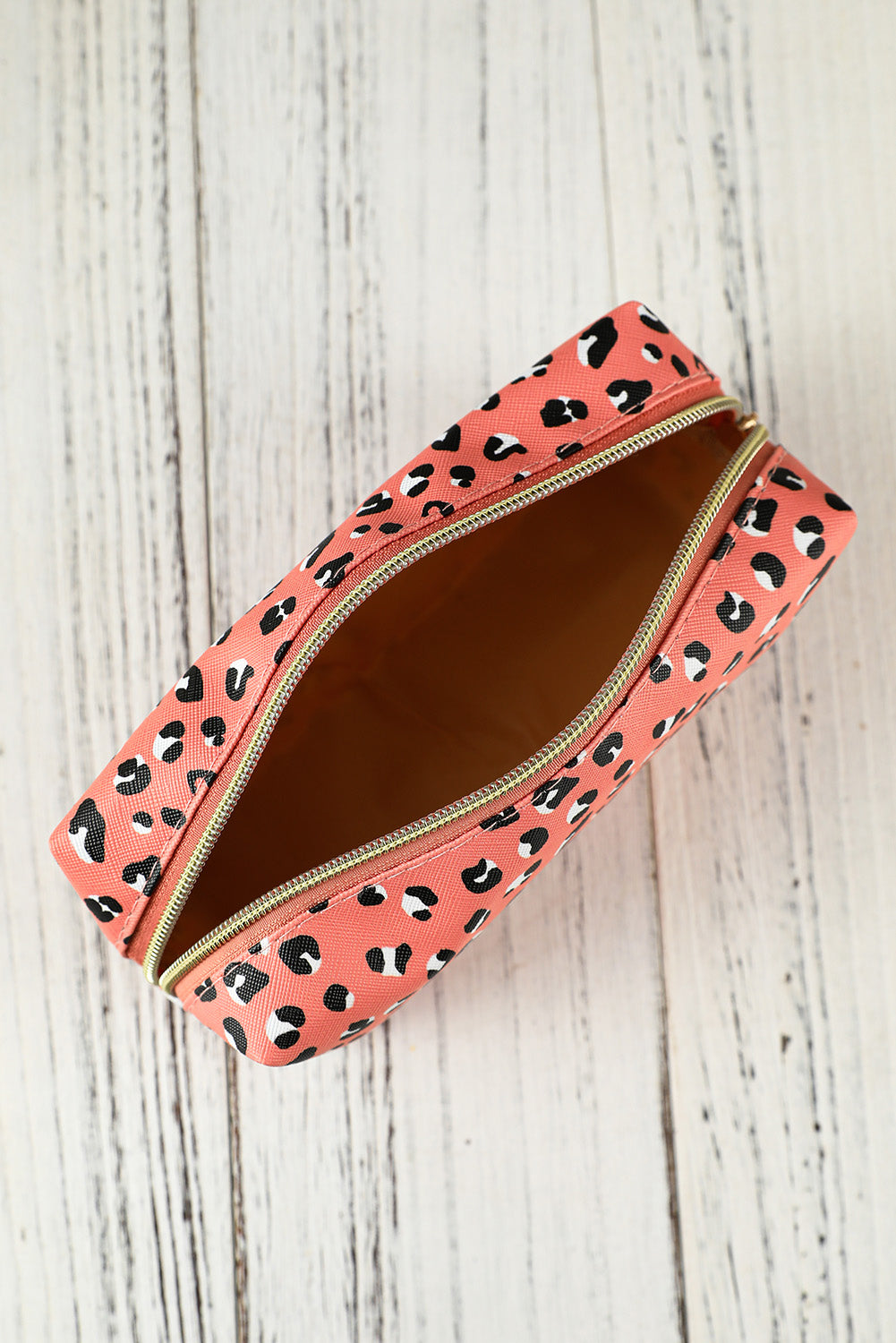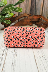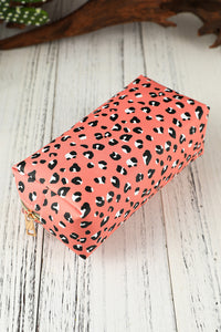 - Stay organized with this stylish pink leopard print cosmetic storage bag.