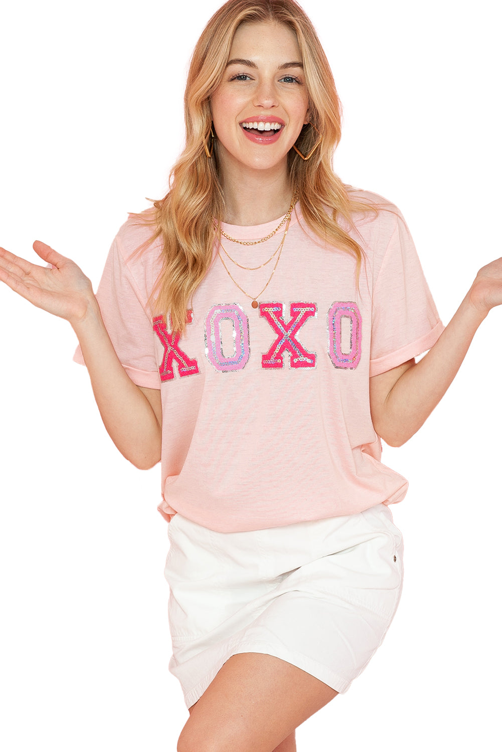 - This pink tee features a stylish XOXO letter print, adding a touch of glam and positivity to your look.