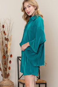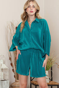 - The set features a button-up shirt with a drop shoulder design and high-waisted shorts that are both comfortable and stylish.