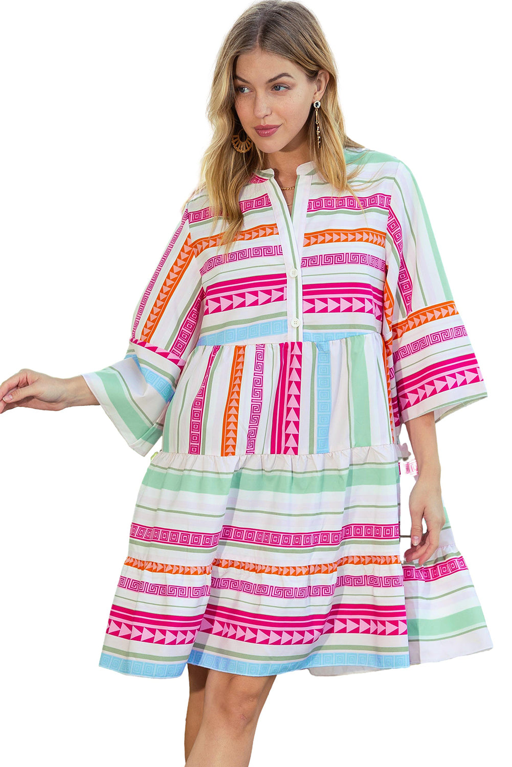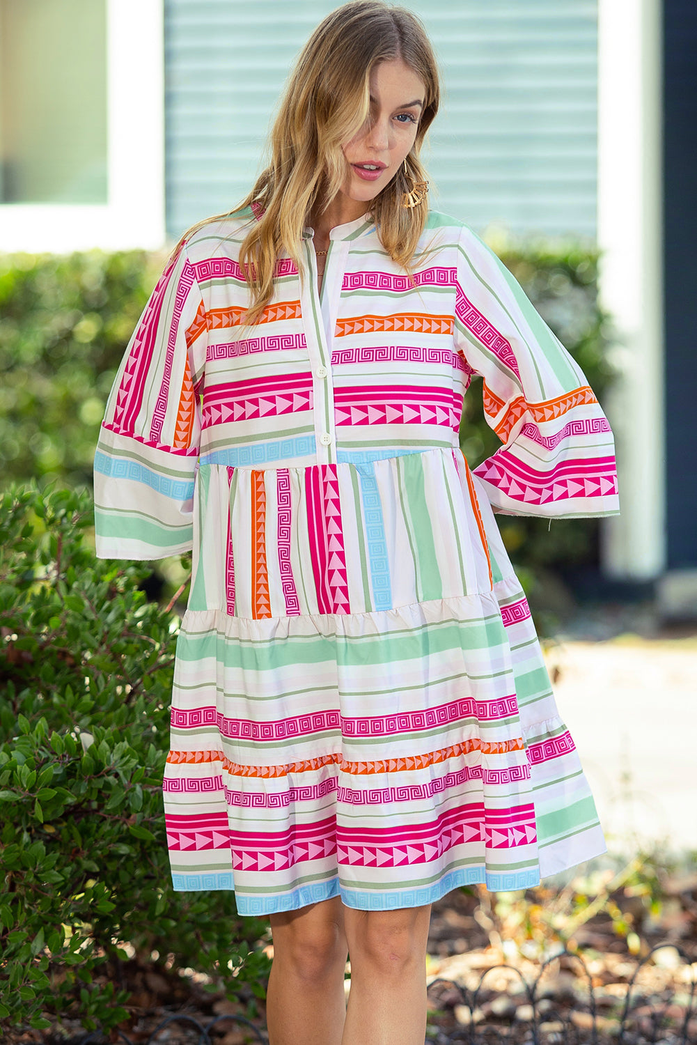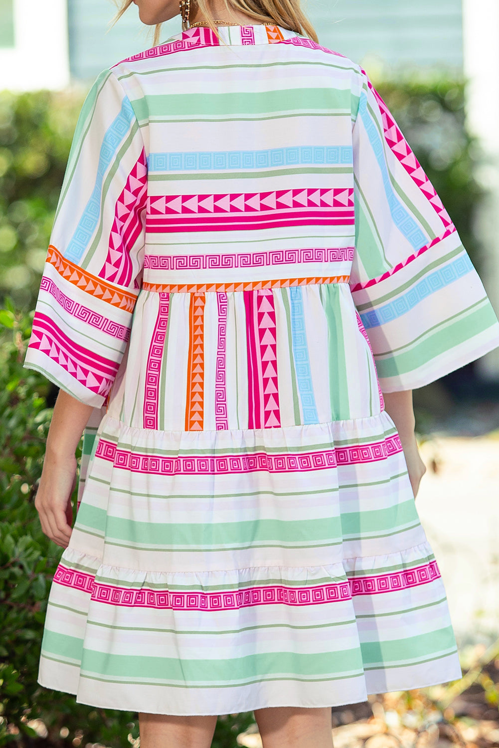 - The Geometric Pattern Ruffle Tiered Mini Dress is a vibrant and playful addition to your wardrobe. Its bold colours and geometric pattern make it a standout piece that's perfect for any occasion where you want to make a statement.
