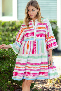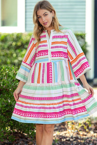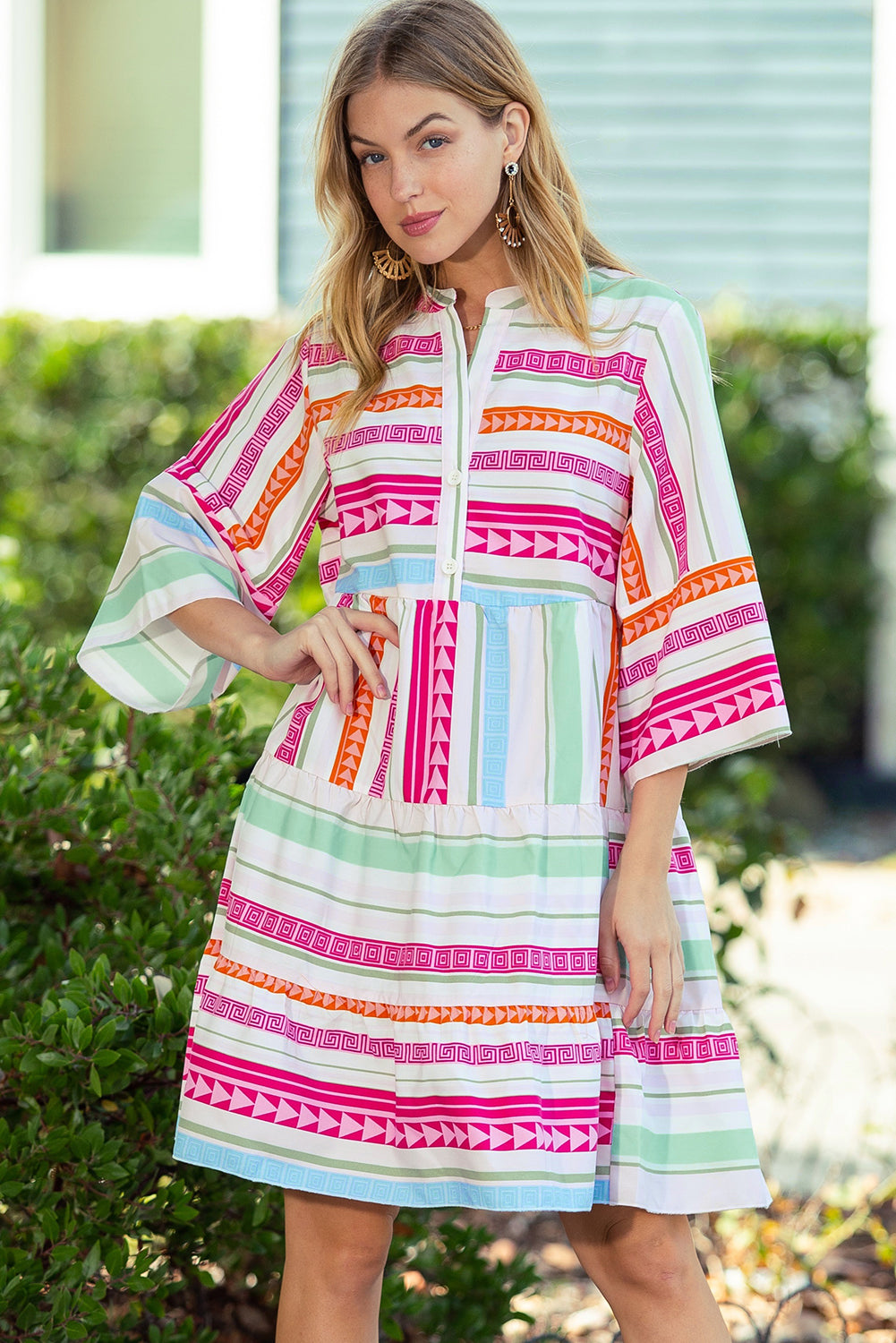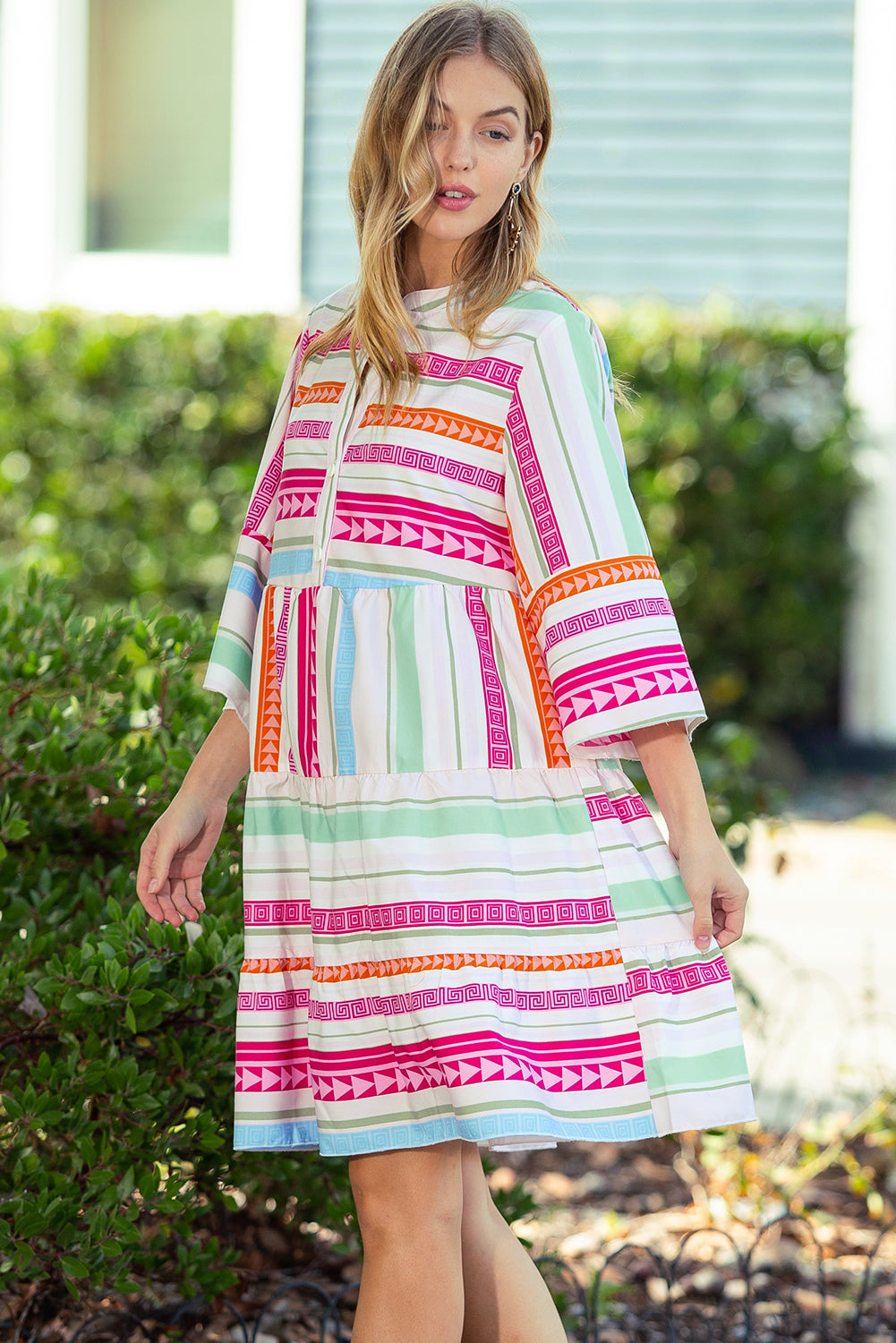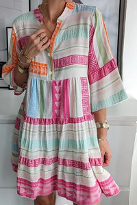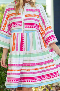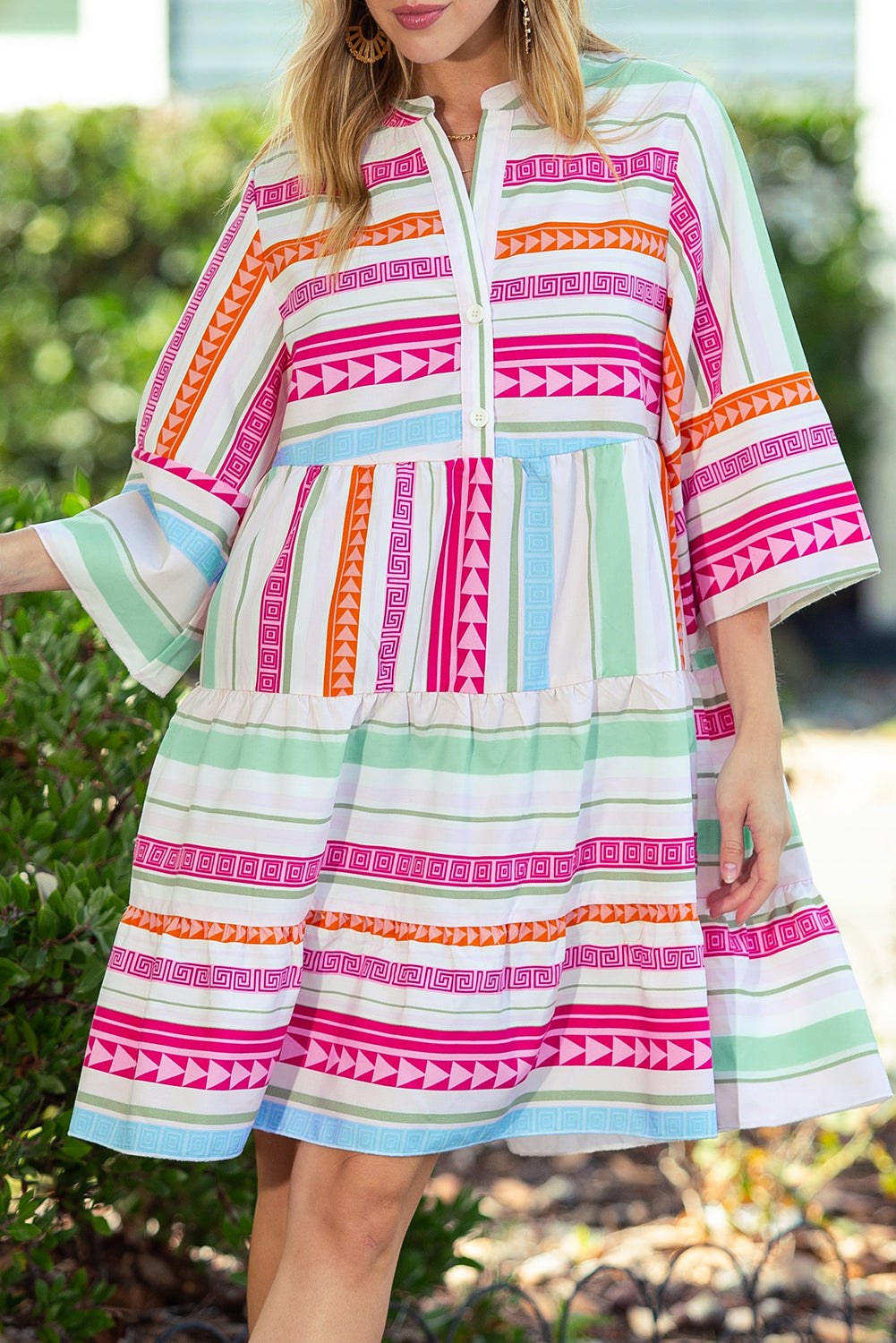 - The Geometric Pattern Ruffle Tiered Mini Dress is a vibrant and playful addition to your wardrobe. Its bold colours and geometric pattern make it a standout piece that's perfect for any occasion where you want to make a statement.