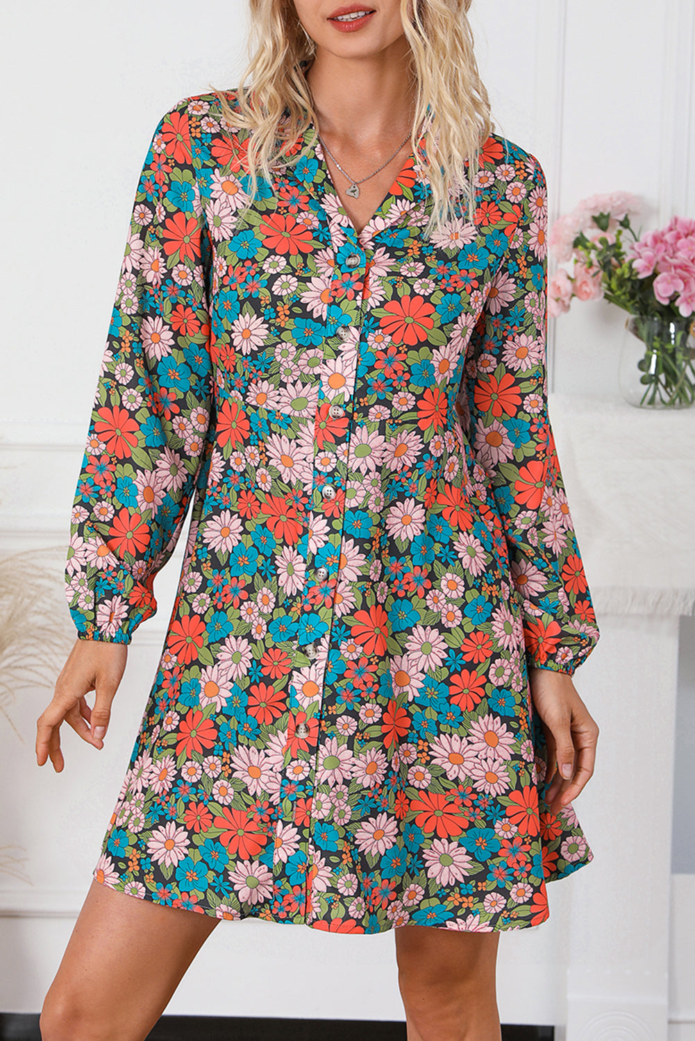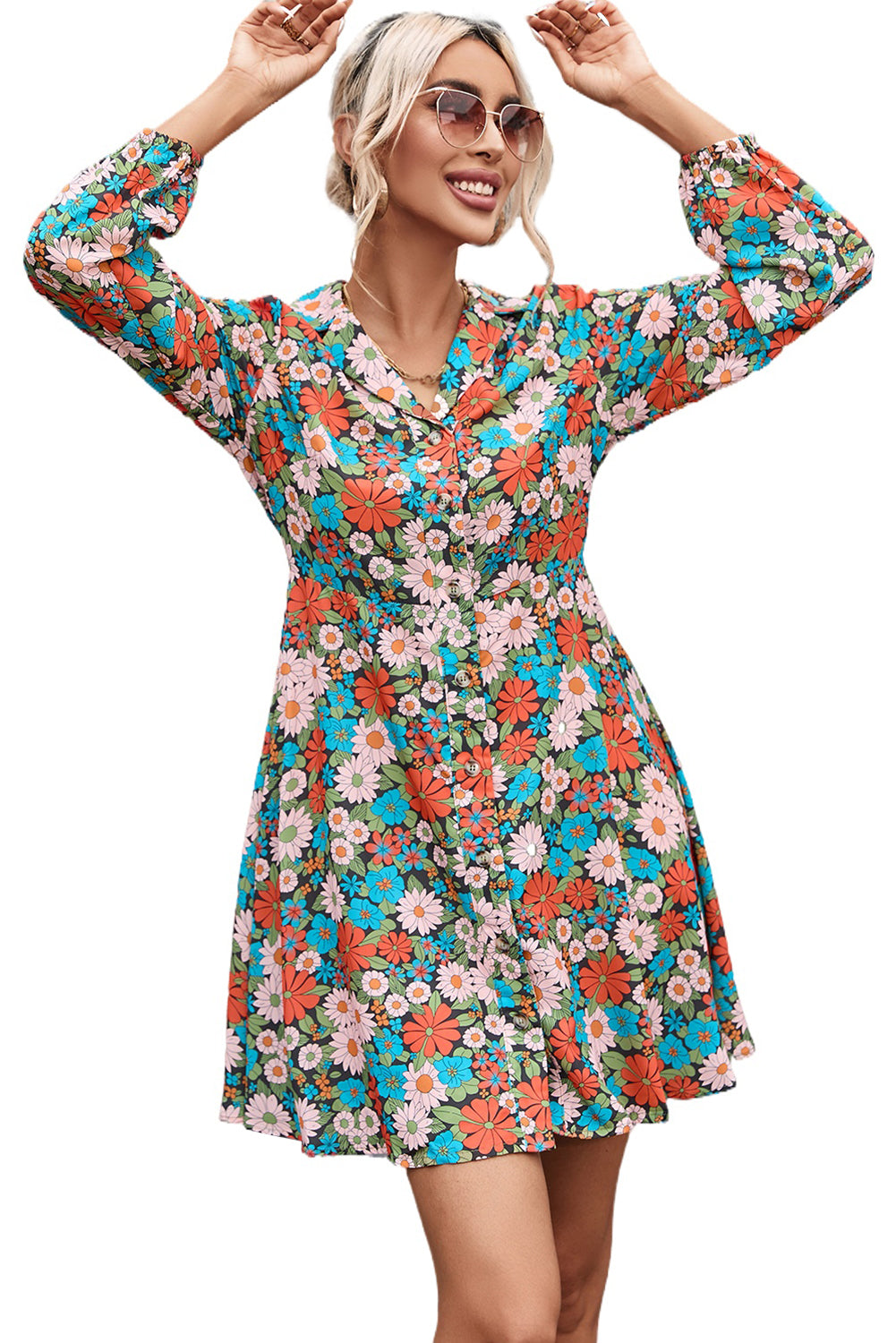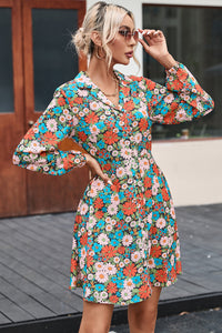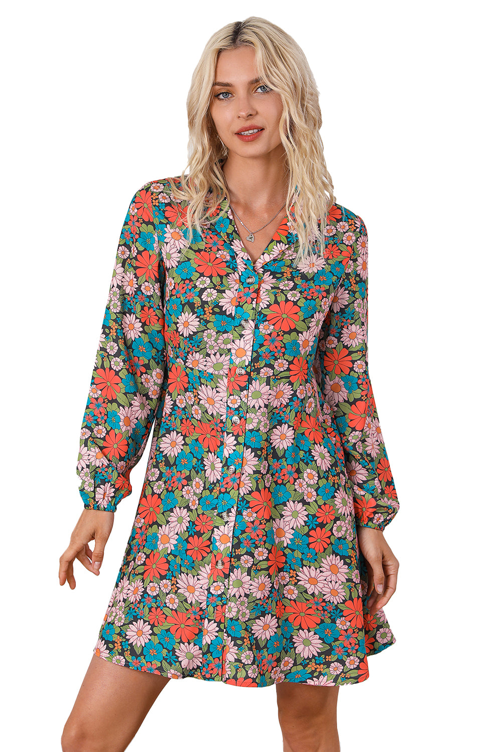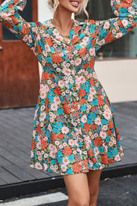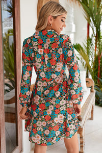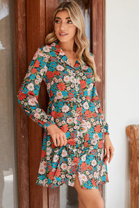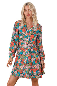 Multicolour Vibrant Floral Print Lapel Collar Button Closure Shirt Dress