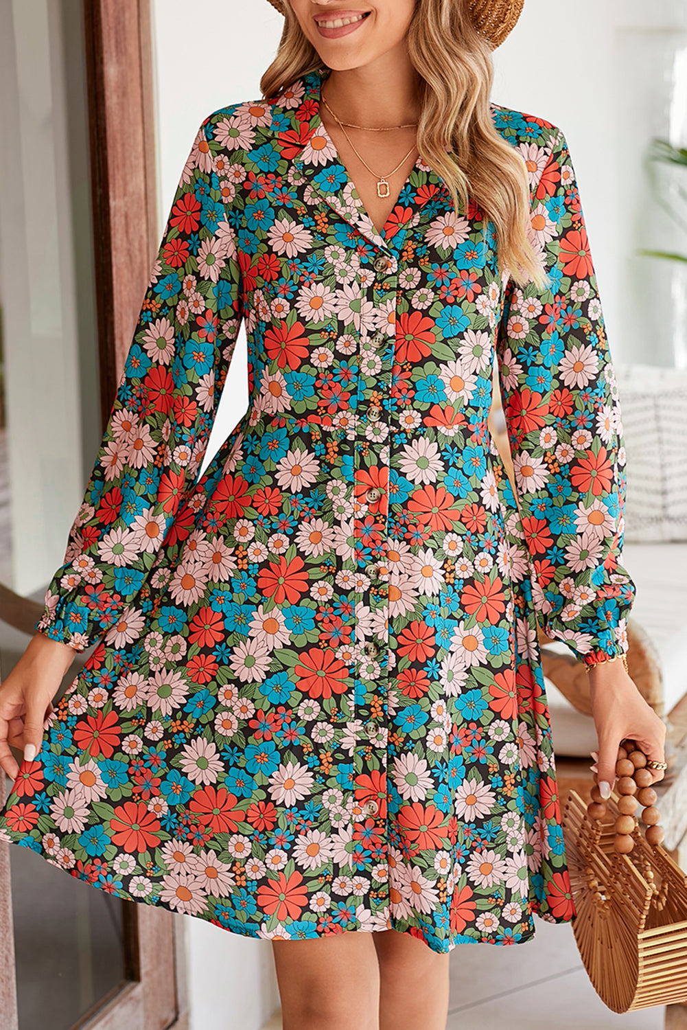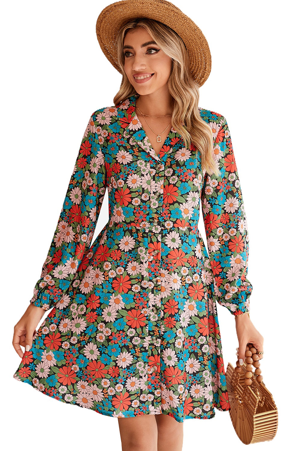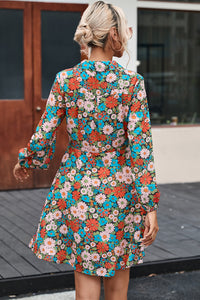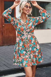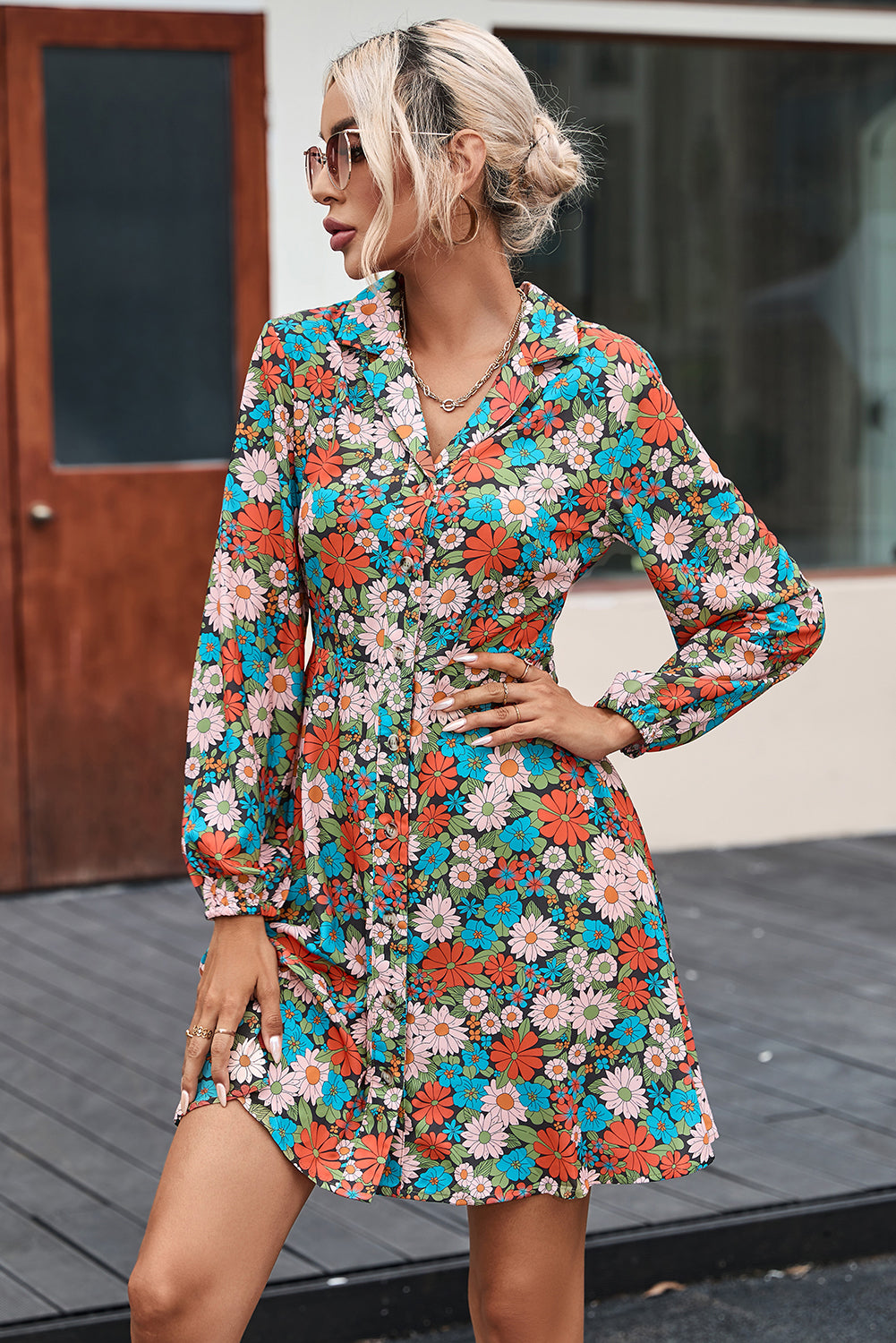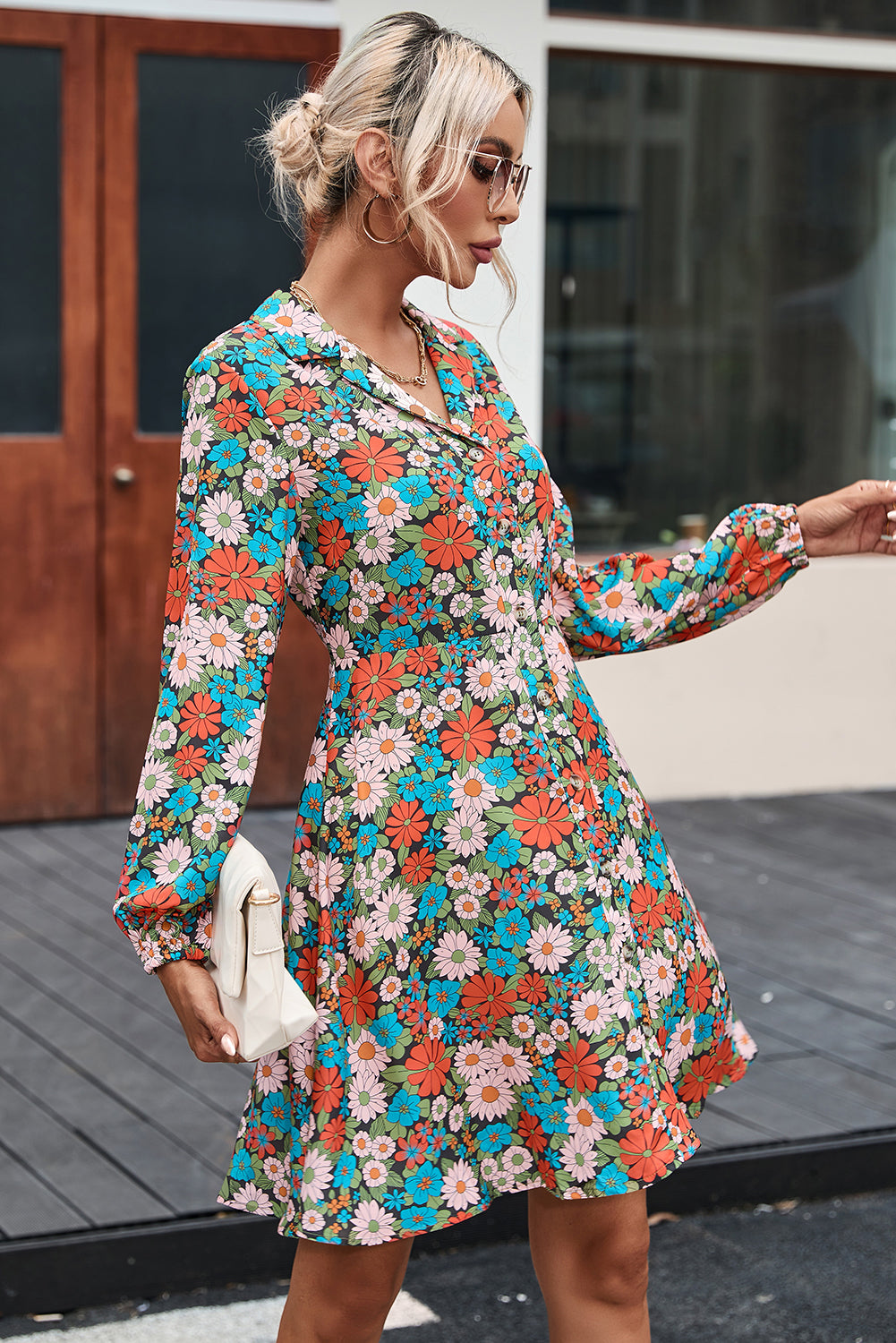 Multicolour Vibrant Floral Print Lapel Collar Button Closure Shirt Dress