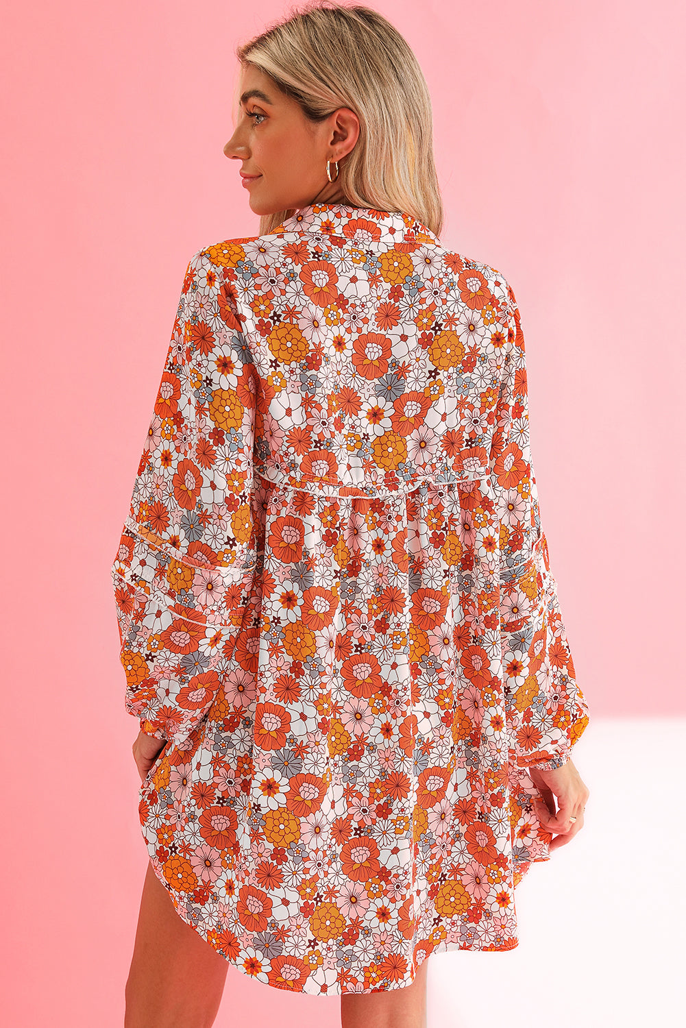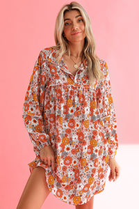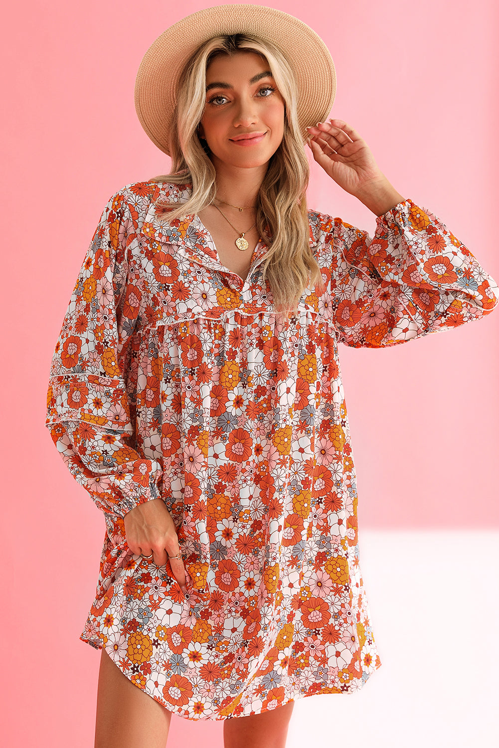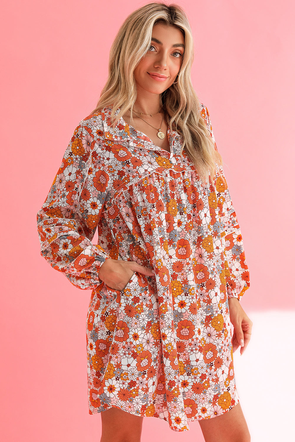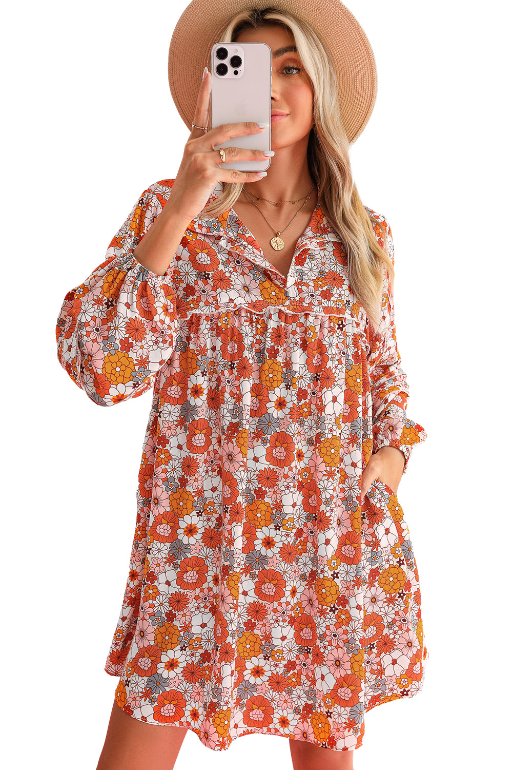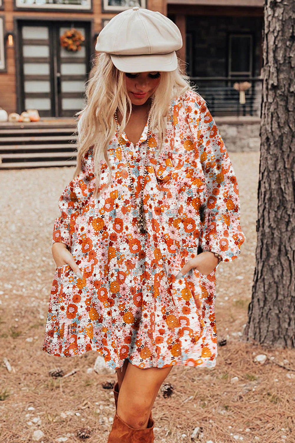 Orange Boho Floral Print V Neck Pocketed Mini Dress