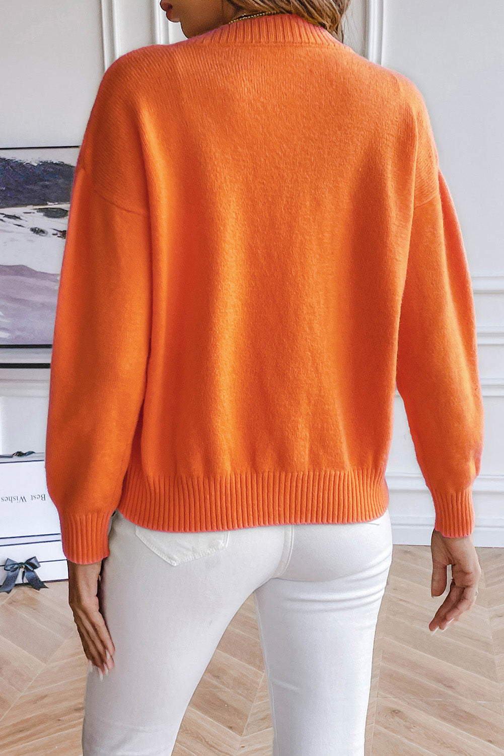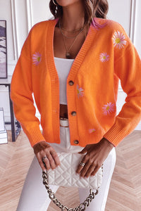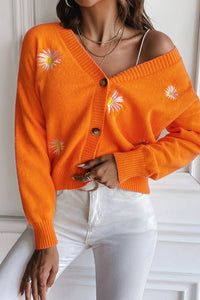 Orange Daisy Embroidered V Neck Button Up Cardigan