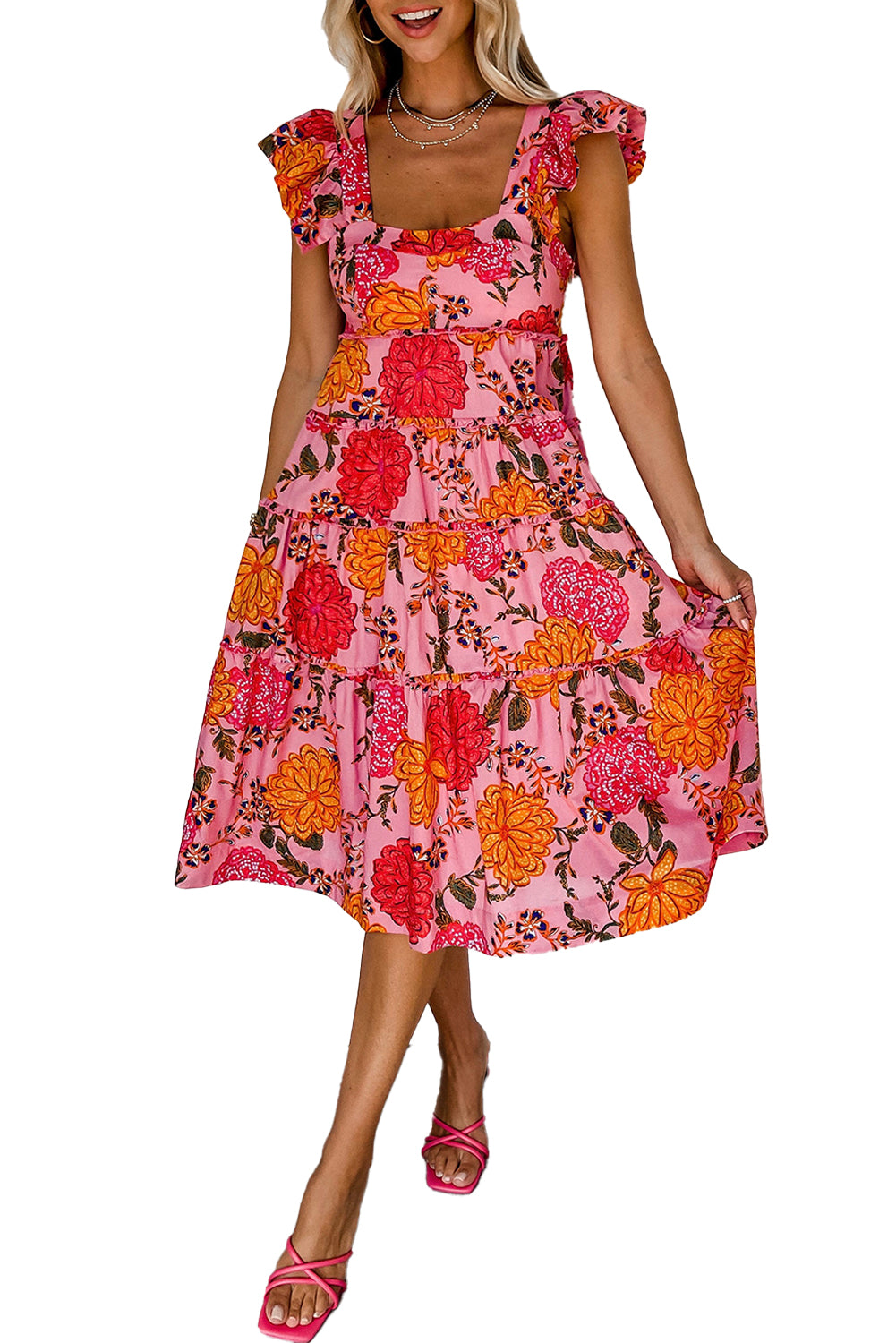Pink Floral Square Neck Ruffled Flutter Sleeve Tiered Midi Dress