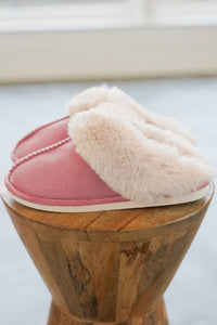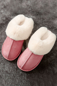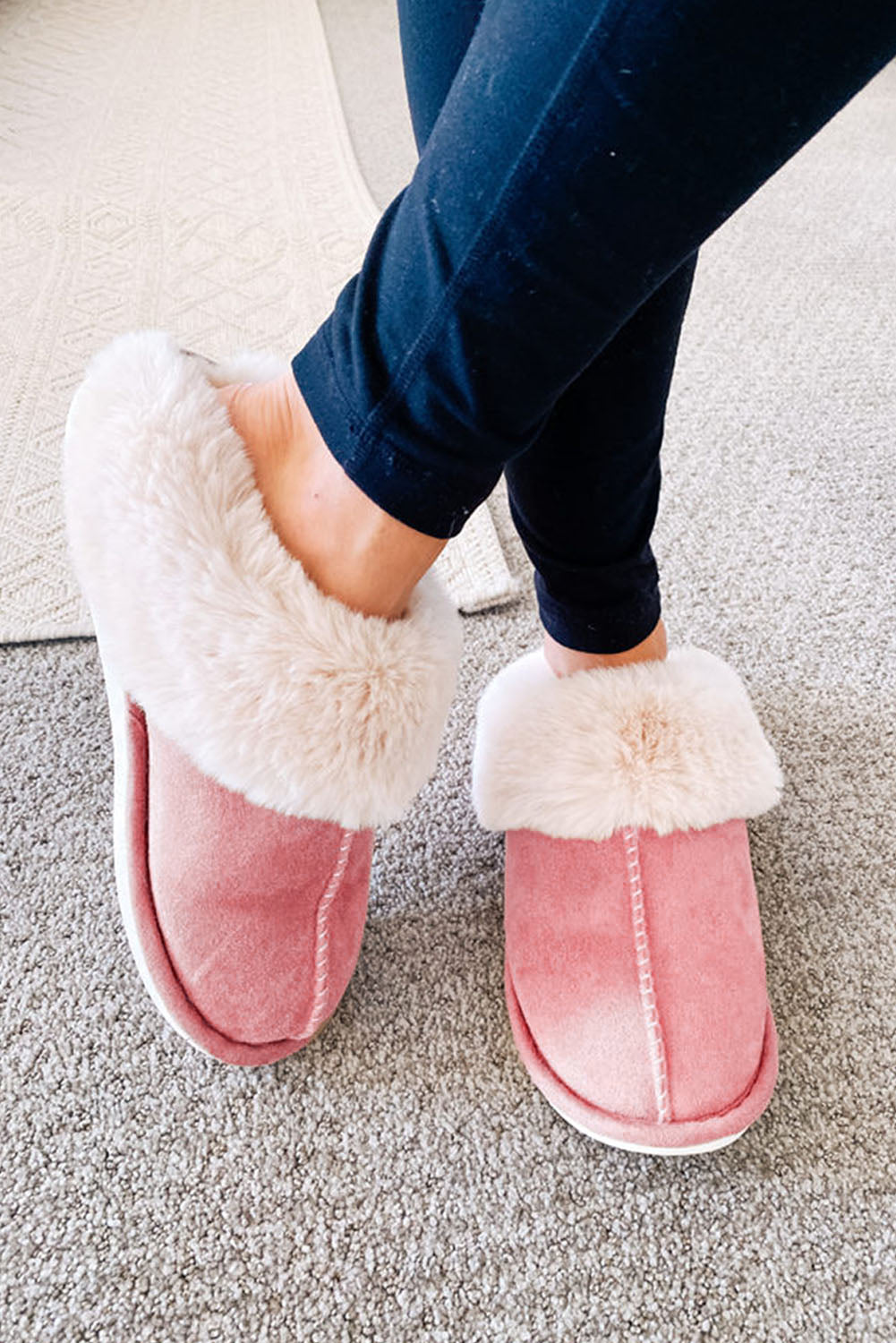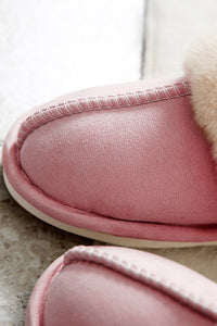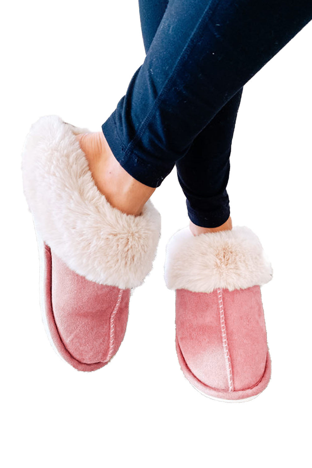 Pink Khaki Faux Suede Plush Lined Slip on Slippers