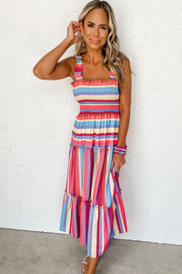 Red Stripe Ruffled Straps Smocked Tiered Long Dress