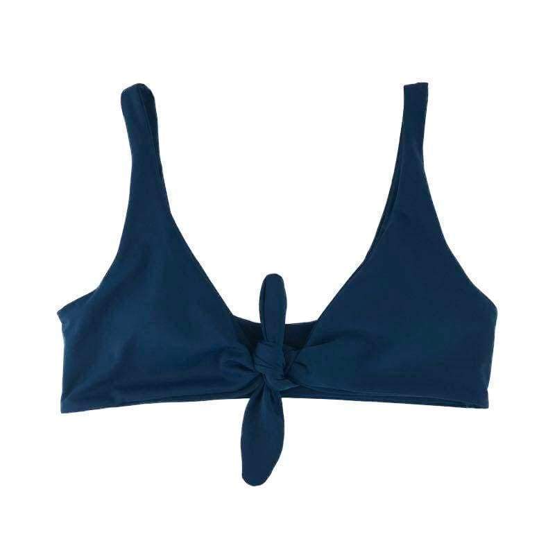 This summer, why not go for something a bit more unique, a bit more risqué, and a bit more sexy? This tie up bikini top comes in a dark, midnight teal color – blending that retro style front tie with an eye popping color.